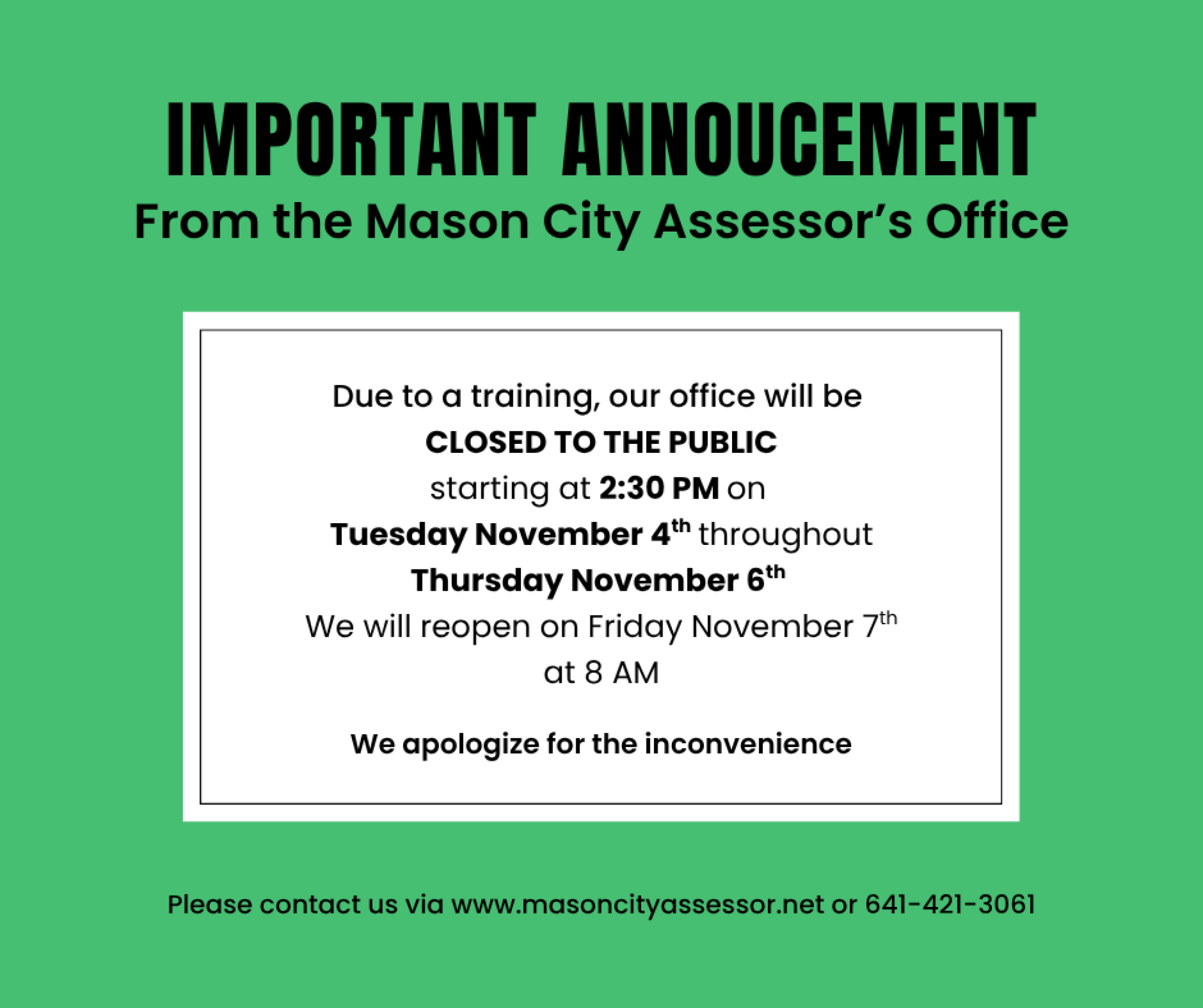 Our office will be closed to the public for a training starting at 2:30 PM on Tuesday November 4th through Thursday November 6th. We apoligize for any inconvenience this may cause. We will reopen at 8 AM on Friday November 7th.